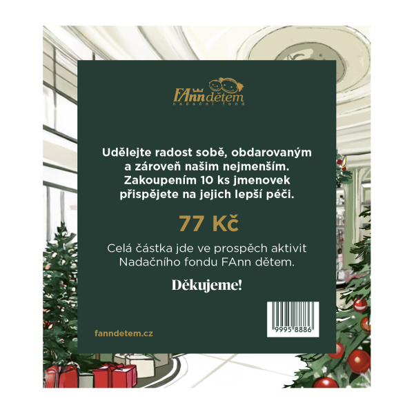 Dodejte svým vánočním dárkům kouzelný detail a zároveň udělejte dobrý skutek. Originální vánoční jmenovky FAnn dětem zkrášlí každý balíček a hlavně – jejich koupí podpoříte charitativní projekty, které přinášejí radost a pomoc tam, kde je to potřeba. Každá jmenovka tak nese nejen jméno obdarovaného, ale i kousek naděje pro ty, kteří ji ocení víc než kdokoli jiný. Udělejte letošní Vánoce ještě krásnější – pro své blízké i pro ty nejmenší, kteří potřebují naši podporu.