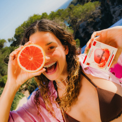 Šumivá kostka k přípravě osvěžujícího nápoje s příchutí grapefruitu, se sladidlem a vitamíny.