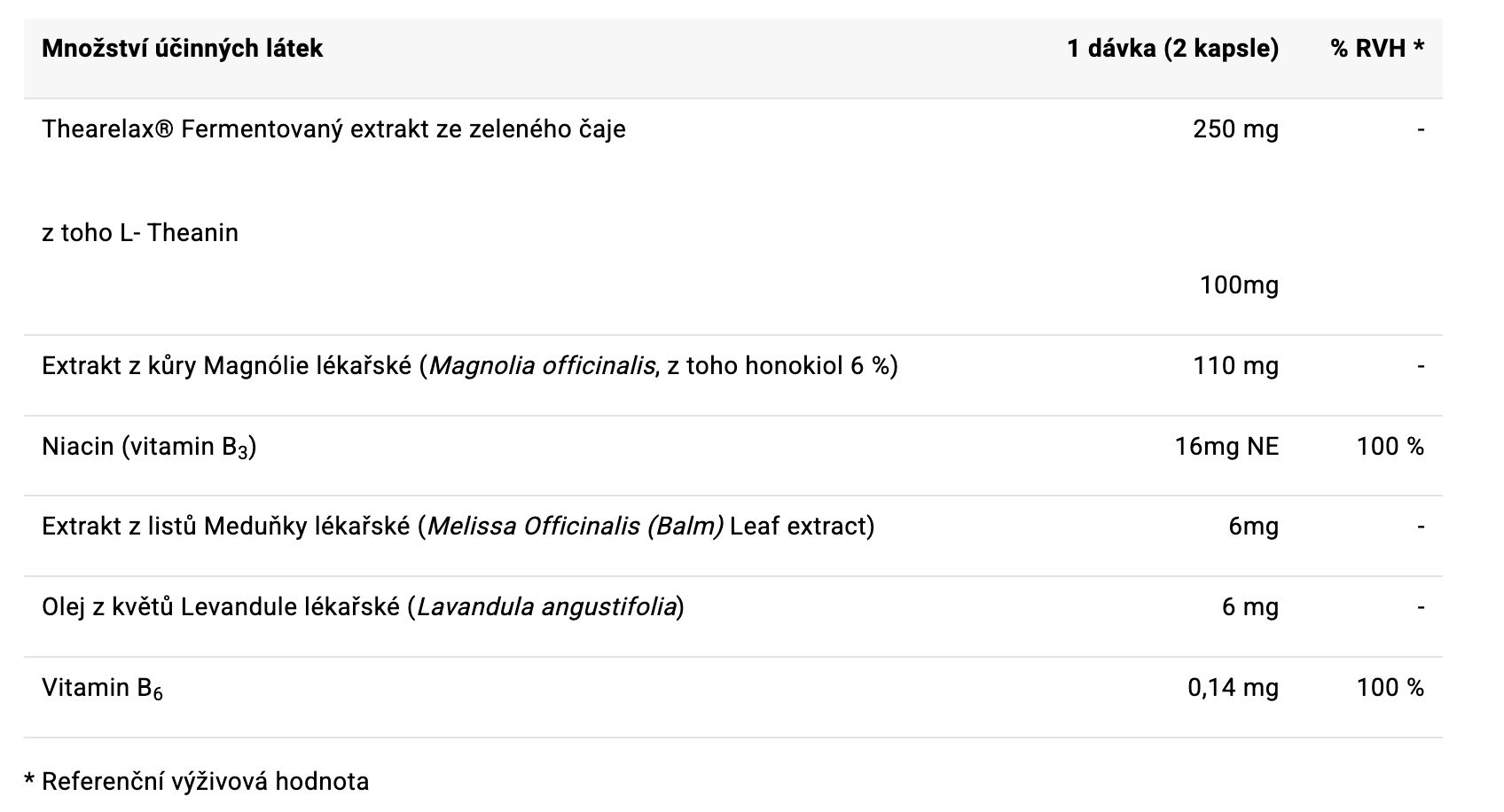 olivový olej, rostlinná kapsle (hydroxypropylmethylcelulosa), Thearelax® fermentovaný extrakt ze zeleného čaje (Camellia sinensis), extrakt z kůry magnólie (Magnolia officinalis, honokiol 6 %), nikotinamid (niacin), protihrud z listů meduňky lékařské (Melissa Officinalis (Balm) Leaf extract), olej z květů a květenství levandule lékařské (Lavandula angustifolia), hořečnaté soli mastných kyselin (protihrudkující látka), pyridoxin hydrochlorid (vitamin B6)